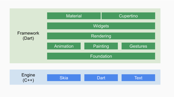 Flutter Framework 最上层应用,我们的应用都是围绕这层来构建,所以该层也是我们打交道最多的层。 改层是一个纯 Dart实现的 SDK,类似于 React在 JavaScript中的作用。它实现了一套基础库, 用于处理动画、绘图和手势。并且基于绘图封装了一套 UI组件库,然后根据 Material 和Cupertino两种视觉风格区分开来。