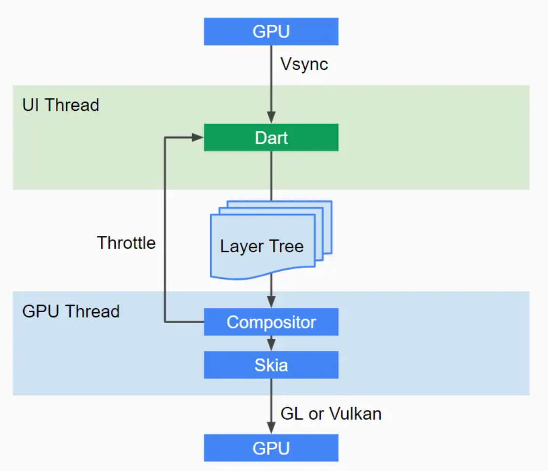 Flutter只关心向 GPU 提供视图数据 ,GPU的 VSync信号同步到 UI 线程,UI线程使用 Dart 来构建抽象的视图结构,这份数据结构在 GPU 线程进行图层合成,视图数据提供给 Skia 引擎渲染为 GPU 数据,这些数据通过 OpenGL或者 Vulkan提供给 GPU。