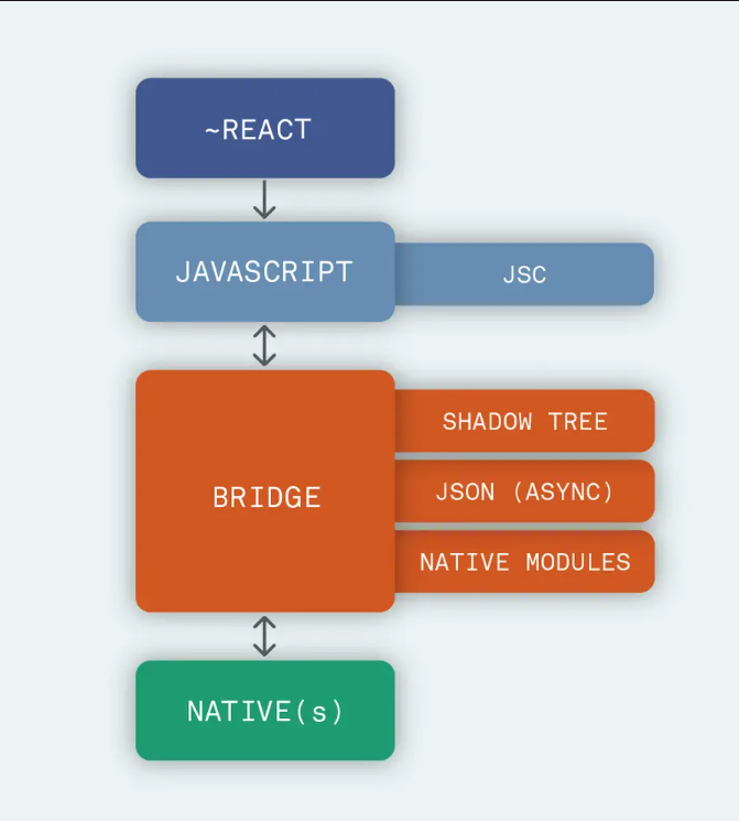 UIManager: 在 Native 里只有它才有权限调用客户端UI JS Thread: 运行打包好的 bundle 文件, 这个文件就是我们写完代码去进行打包的文件, 包含了业务逻辑, 交互和模块化组件 Shadow Node: Native 的一个组件树, 可以监听 App 里的 UI 变化, 类似于虚拟 DOM 和 DOM Yoga: Fackbook 开源的一个布局引擎, 用来把 Flexbox 的布局转换为 Native 的布局 运行流程 用户点击 App 图标 UIManager 线程: 加载所有 Native 库和 Native 组件比如 Images, View, Text 告诉 JS 线程, Native 部分准备好了, JS 侧开始加载 bundle 文件 JS 通过 Bridge 发送一条 Json 数据到 Native , 告诉 Native 怎么创建 UI, 所有的 Bridge 通信都是异步的, 为了避免阻塞 UI Shadow 线程最先拿到消息, 创建 UI 树 Yoga 引擎获取布局并转为 Native 的布局 之后 UI Manager 执行一些操作展示 Native UI Brige的缺点 有两个不同的领域 JS 和 Native, 他们彼此之间不能相互感知, 也并不能共享相同内存 通信基于 Bridge 的异步通信, 所以并不能保证数据百分百及时传达到另一侧 JSON 传输大数据非常慢, 内存不能共享, 所有的传输都是新的复制 无法同步更新 UI, 比方在渲染列表的时候, 滑动大量加载数据, 屏幕可能会发生卡顿或闪烁 RN 代码仓库很大, 库比较重, 所以修复 Bug 和开源社区贡献代码的效率也相应更慢