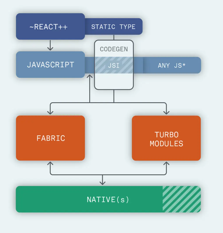 CodeGen:作为一个工具来自动化的实现Javascript和Native端的兼容性,它可以让开发者创建JS的静态类,以便Native端(Fabric和Turbo Modules)可以识别它们,并且避免每次都校验数据,将会带来更好的性能,并且减少传输数据出错的可能性。